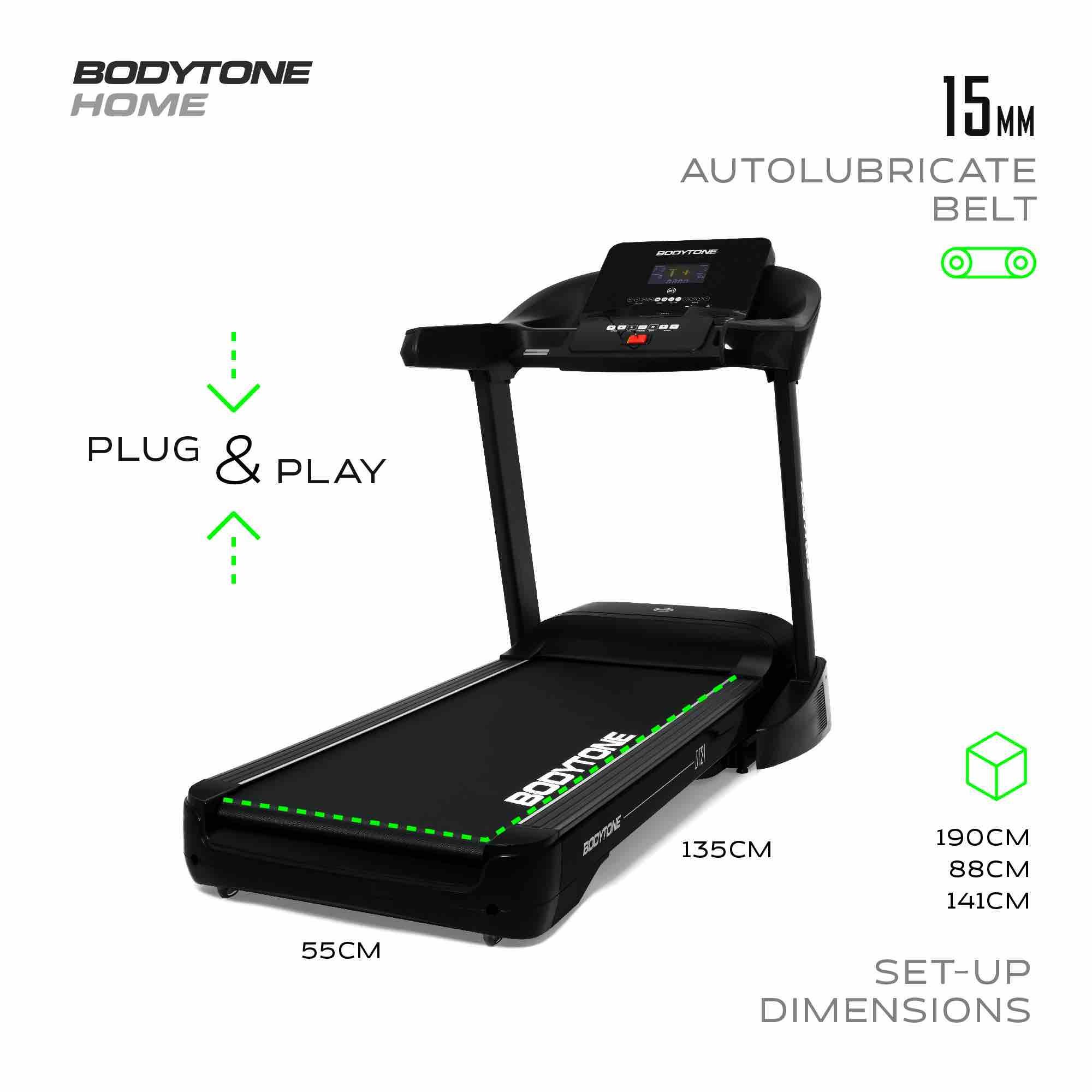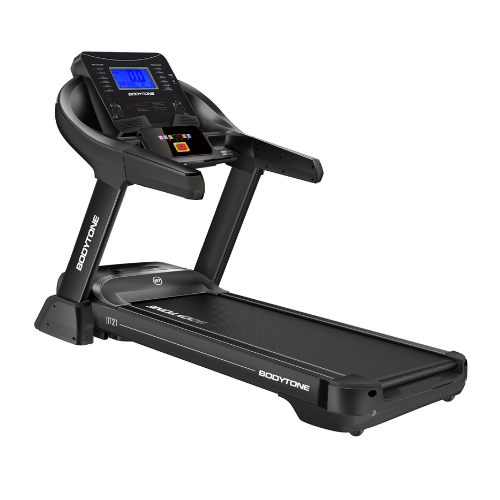 The BODYTONE DT21 treadmill has a motor of approx. 4 horsepower, an extra large running surface, and an LED screen. Other features include: