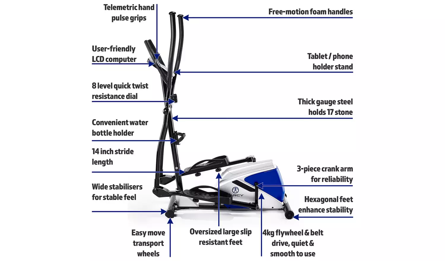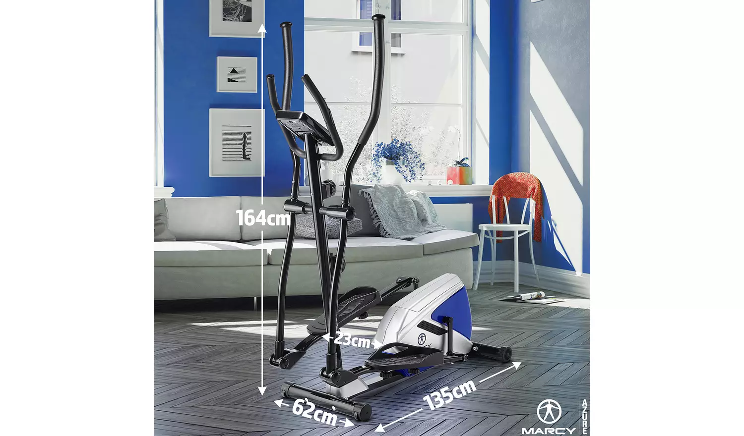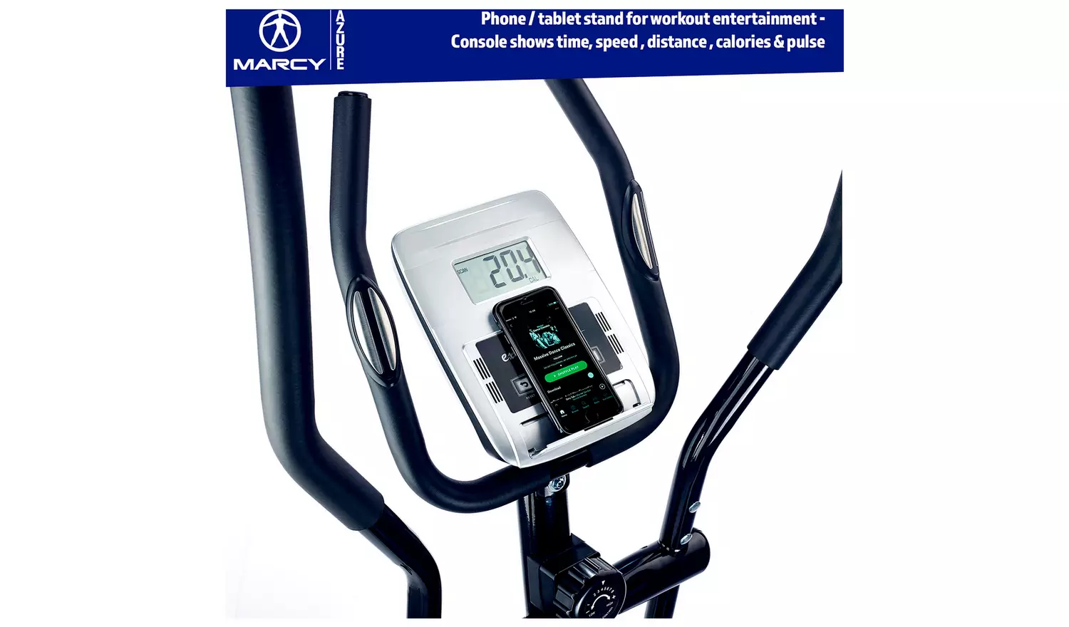 The Marcy Azure Cross Trainer is a high-quality cross trainer packed with tonnes of features to help you work out and reach your fitness goal. Equipped with a belt-driven 4 kg flywheel and 8 magnetic resistance levels for a smooth, fluid and silent workout. The Azure Cross Trainer also has a 3-piece crank and a 14″ Stride length for working out comfortably. Stay motivated with the built-in device holder and easy to use battery powered LCD display where you can track your performance through the 5 feedback setting including a pulse rate monitor.