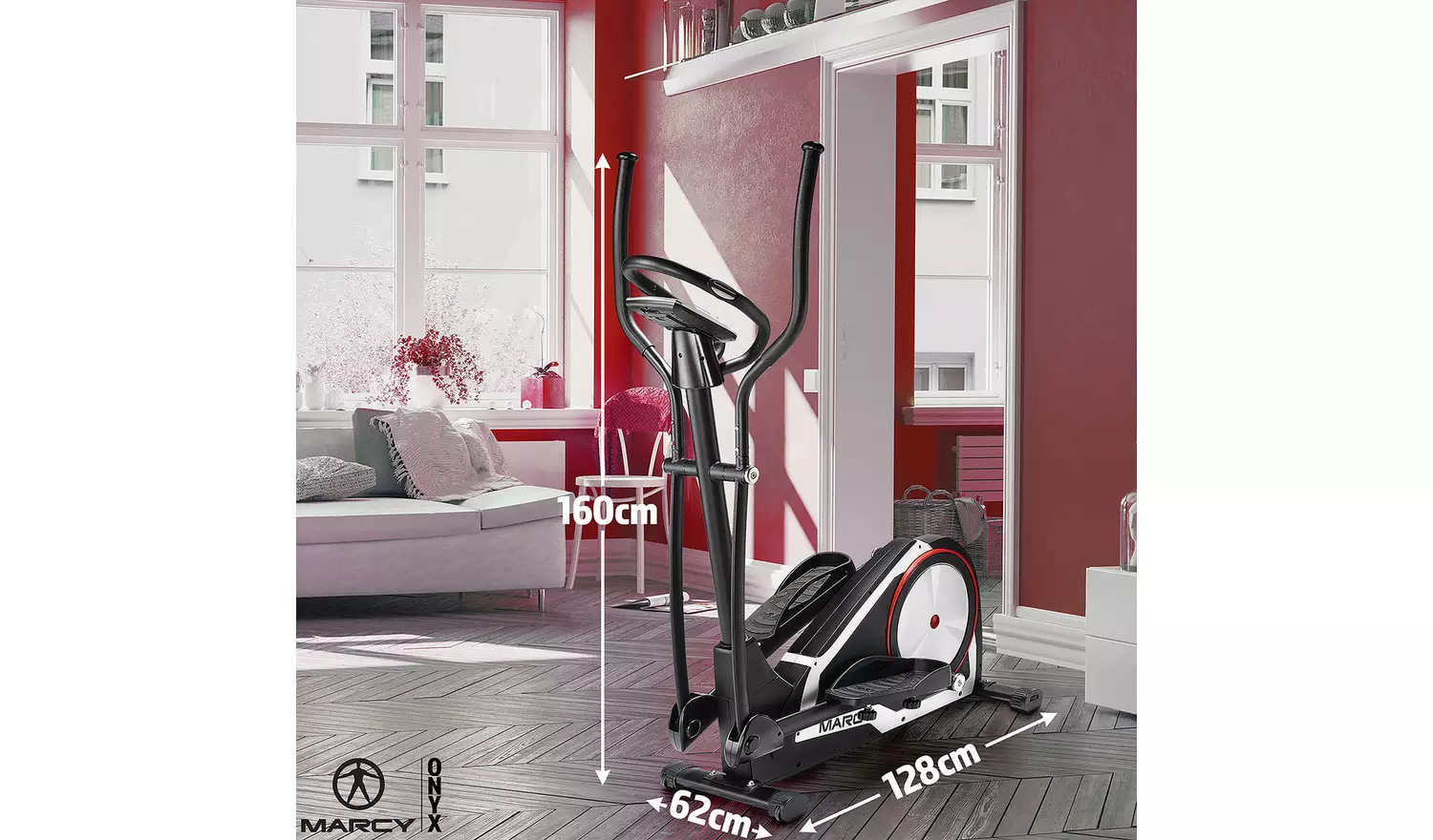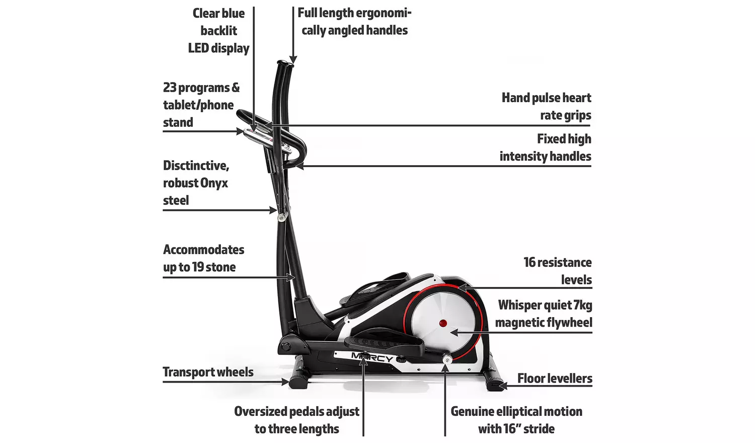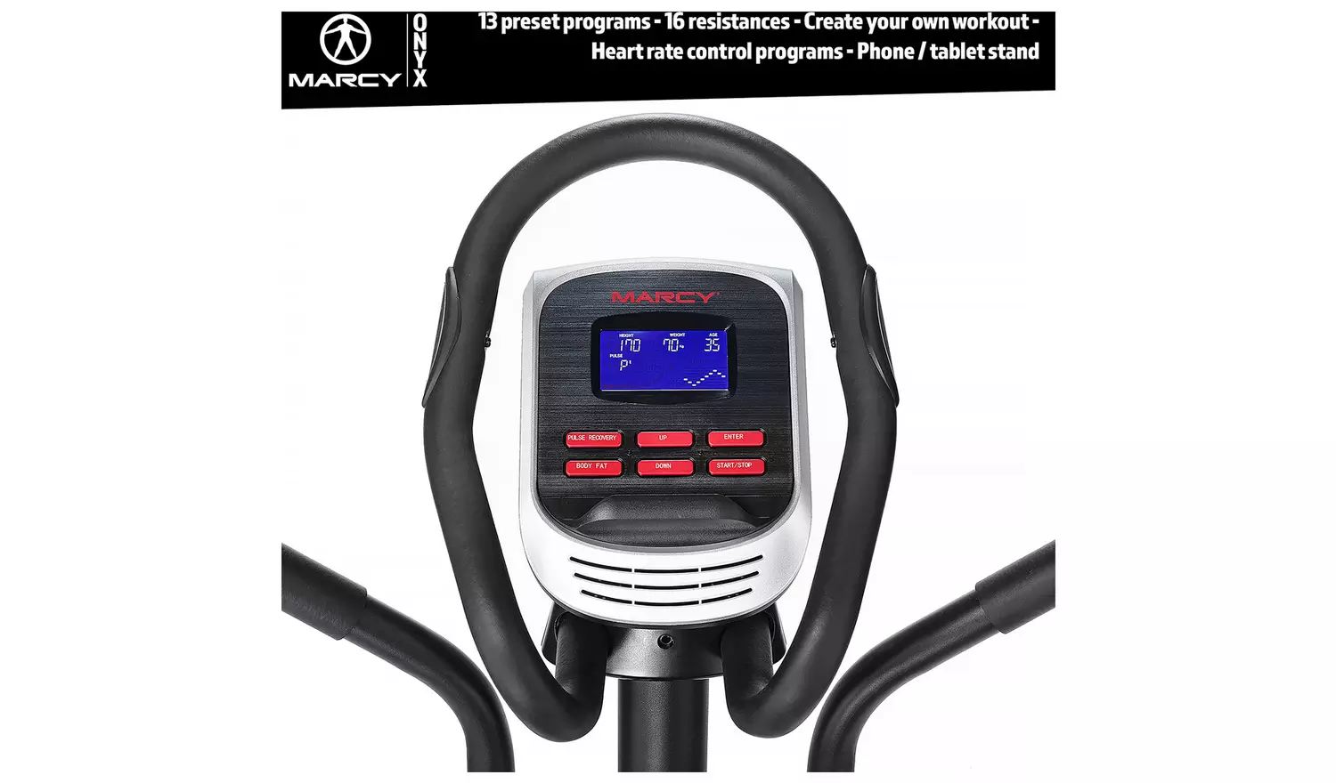 Your home fitness salvation has landed in the form of the Marcy C80 Magnetic cross trainer. The ultra-sleek 2 tone modern cross trainer offers a two-way bearing, 7 kg flywheel with 16 magnetic resistance levels, and 23 engaging programs displayed on a backlit blue LED console. Track your workout progress through the Marcy C80 cross trainer’s 8 different console feedback settings, including Speed, Calories, Time, Body Fat, Recovery and heart rate with the hand pulse grips integrated into the handlebars around the console.
