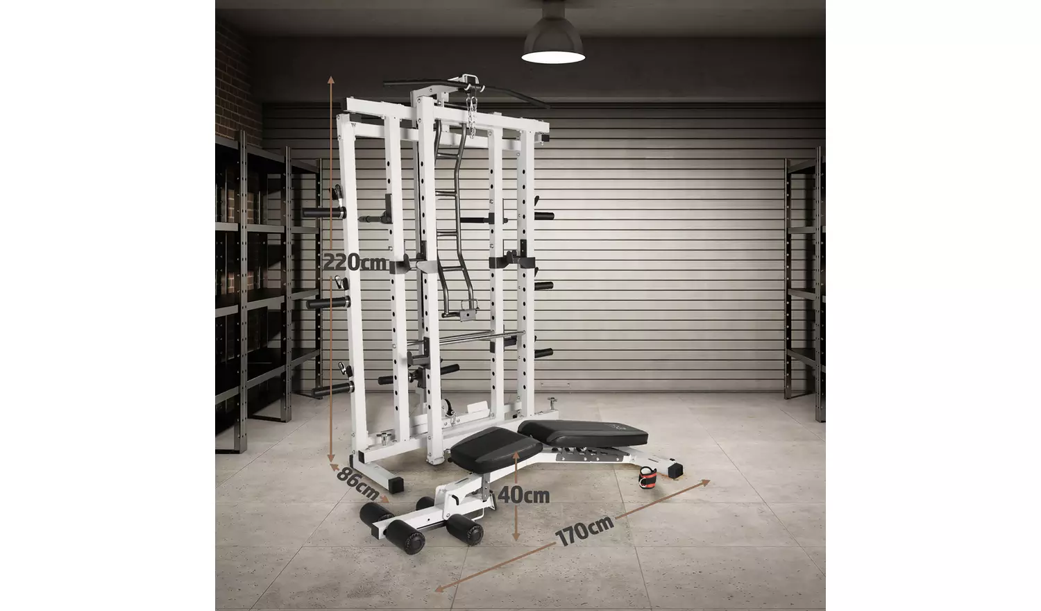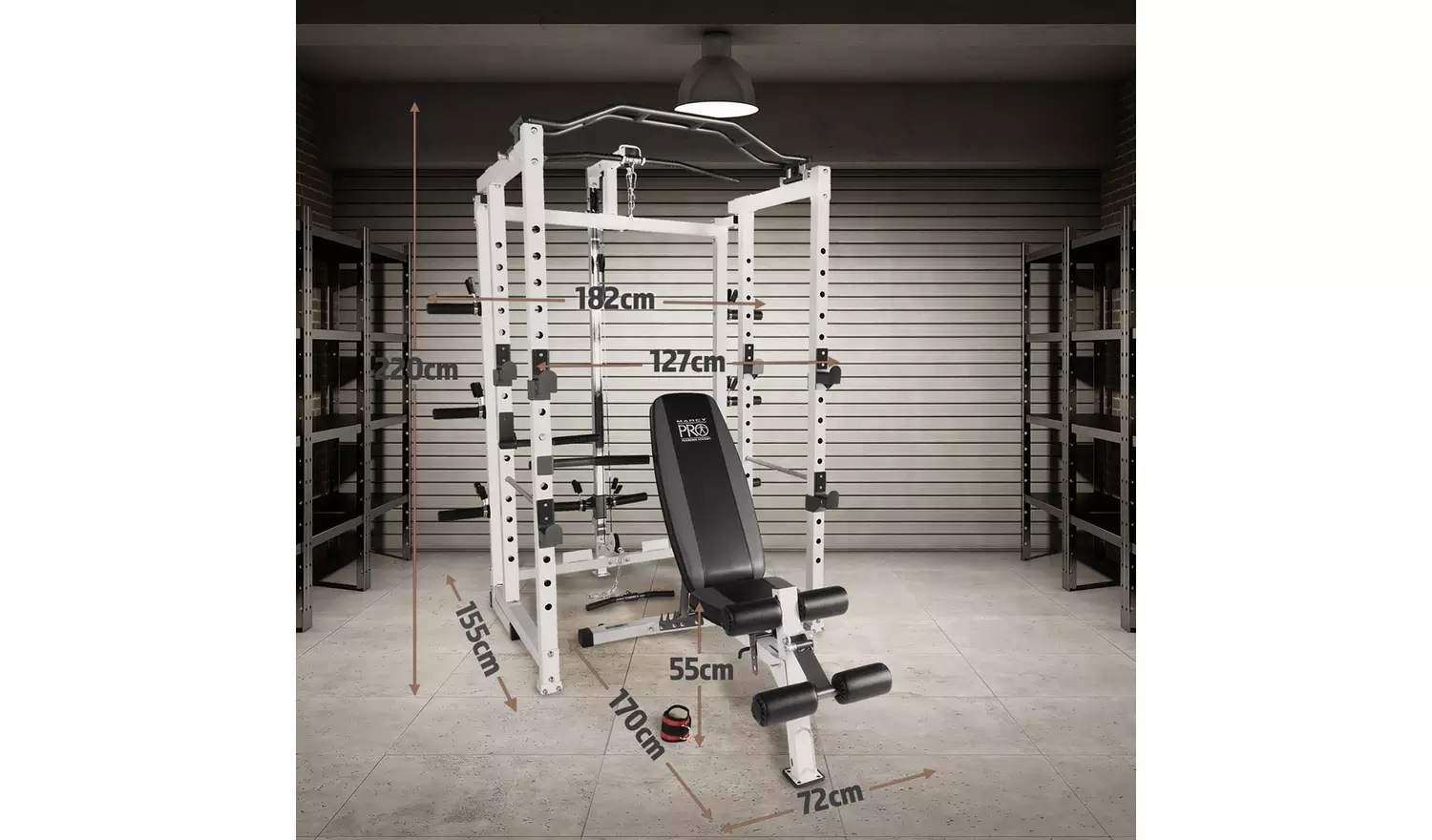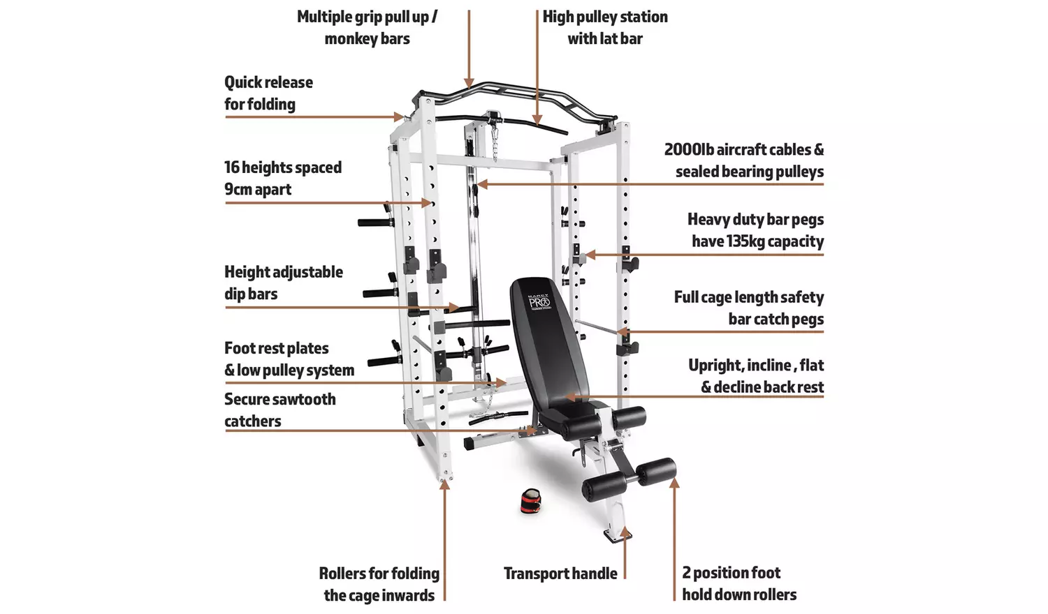 A cage that folds! It must be flimsy? Not the Marcy Pro Folding Cage. A genius roller folding system effortlessly collapses the frame inwards to half depth. Better still, this doesn’t impinge the cages structural integrity, this whopper can comfortably carry up to 135kg . The cage; however, is more than a cage, it’s a complete gym. PLEASE NOTE THIS ITEM IS DELIVERY TO KERBSIDE ONLY.