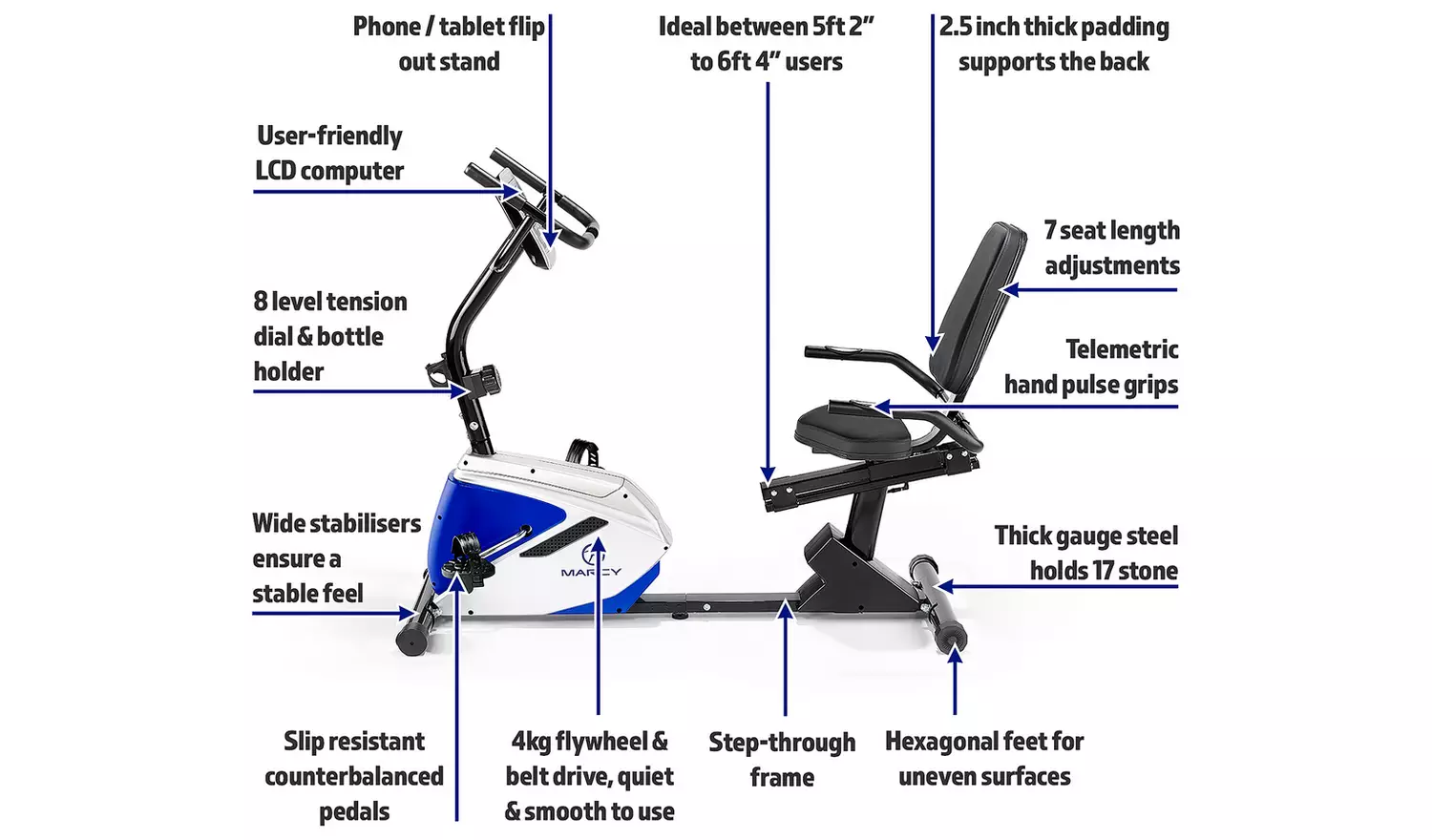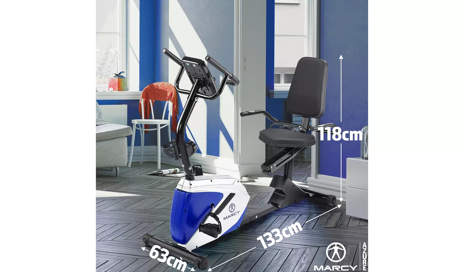 The Marcy RB1016 Azure Recumbent Bike features a large padded seat and back pad for comfort and 2 button touch battery-powered LCD display console, which allows you to monitor your cardio workout performance. Equipped with a 4kg magnetic resistance flywheel, 8 adjustable resistance levels for smooth transitions, and integrated pulse sensors in both handlebars to monitor and record your heart rate. The Marcy RB1016 Recumbent Bike has been designed to help you reach your fitness goal, whether weight loss or improving your fitness levels.