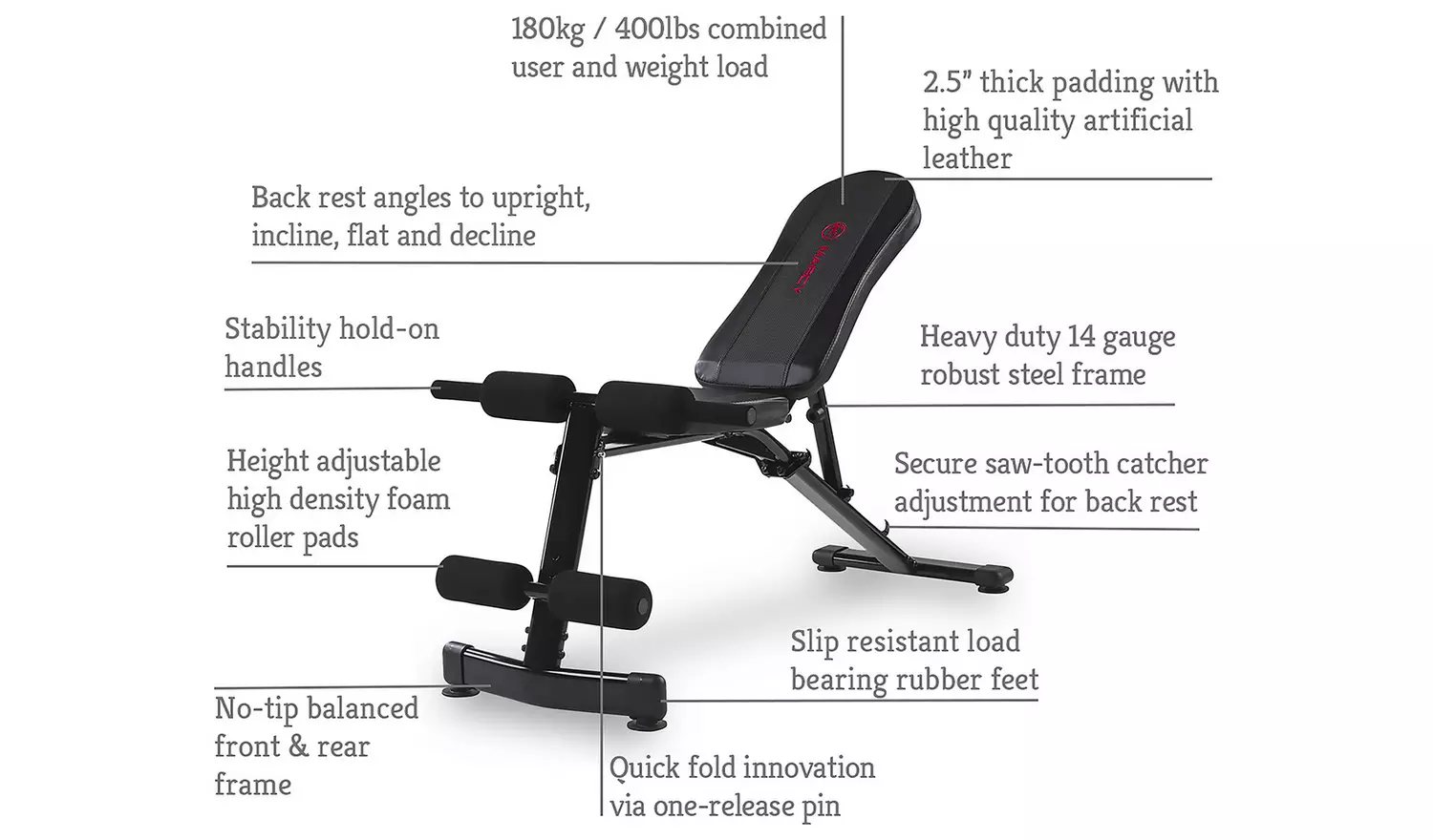 - 14 gauge heavy duty solid steel frame enables loads up to 180kg (400lbs), 2.5 inch thick deluxe upholstery provides comfortable back support.