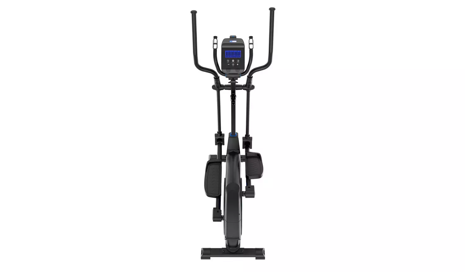 With the Pro Fitness XT3000 cross trainer you can add something different to your workout all while burning calories, improving your cardio fitness and boosting your overall fitness. With 18 speed resistance levels you can make small changes as you progress. It has comfortable steps and two way inertia wheels for a smooth workout and a 9kg, dual action flywheel and 380mm stride length give you exceptionally smooth motion. The hand grip pulse sensor monitors your heart rate via a 5 inch blue backlight LCD display.