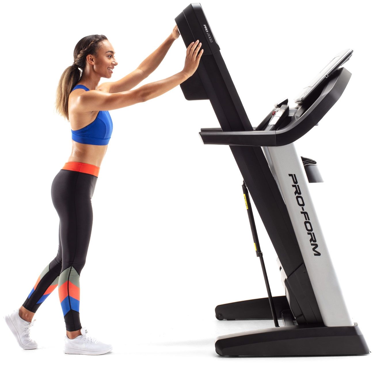 Challenge yourself and meet your goals with the ProForm Pro 2000 Treadmill. It offers an effective way to exercise indoors so you can get fit in your own home. This workout treadmill offers 32 different workout apps to choose from, simulating different scenarios from an outdoor run through the city to a hike on a forested trail. The speed and incline can be increased or decreased as needed to meet your preferences. There is also a fan to keep you cool and a built-in entertainment system for added motivation. Balanced rollers and ProShox cushioning help to absorb impact and keep you running smoothly along the belt as it moves beneath your feet. An integrated holder keeps your tablet in place so you can use the iFit app for an even more effective workout. Hold onto the front handle and use the wireless chest strap to monitor your heart rate and pulse. The ProForm Pro 2000 Treadmill also folds up for space-saving storage.