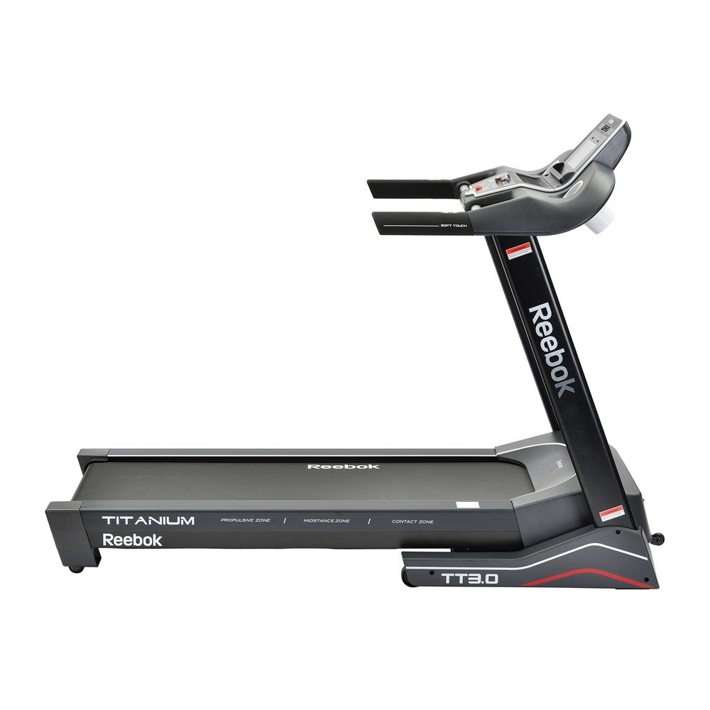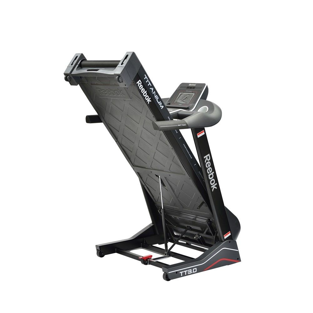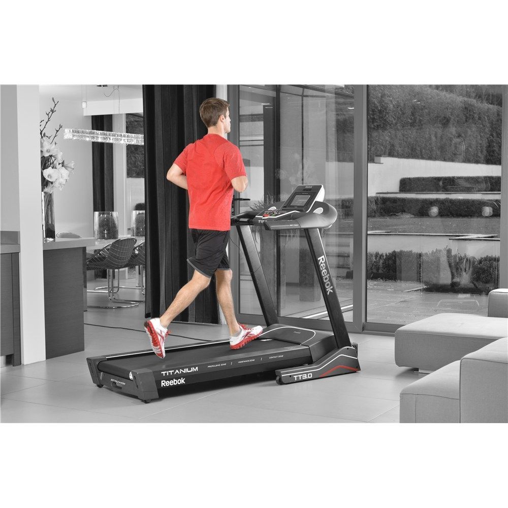 The main design feature is the innovative TripleFlex Cushioning System in the large running area that supports and enhances your running by incorporating a shock-absorbing contact zone, a fluid mid-stance zone and a push-off area that gives great propulsion. The running belt is 2.5mm (0.1”) thick and responsive. The excellent console has an 18cm (7”) backlit LCD display with Reebok’s iDrive system and you can connect the treadmill to iOS and Android tablets and mobiles via Bluetooth. It offers 17 varied workouts, full workout feedback, user profiles, HR measurement, a music port and speakers, a fan, a USB charger and can fold up after use.